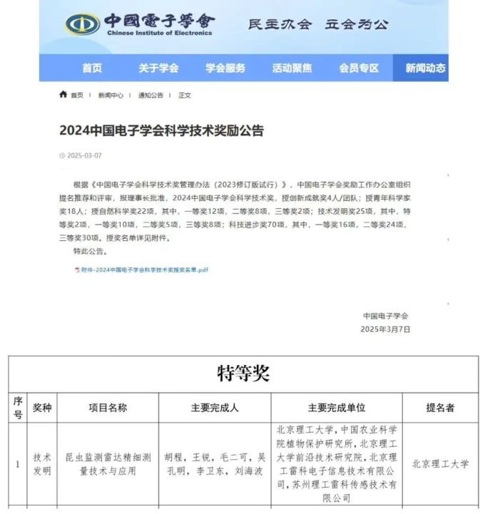 近日,2024年度中国电子学会科学技术奖励结果正式揭晓。由北京理工sunbet申搏官方网站电子信息技术有限公司(以下简称"理工sunbet申搏官方网站")参与研发的"昆虫监测雷达精细测量技术与应用"项目,荣获"2024中国电子学会技术发明特等奖"。
