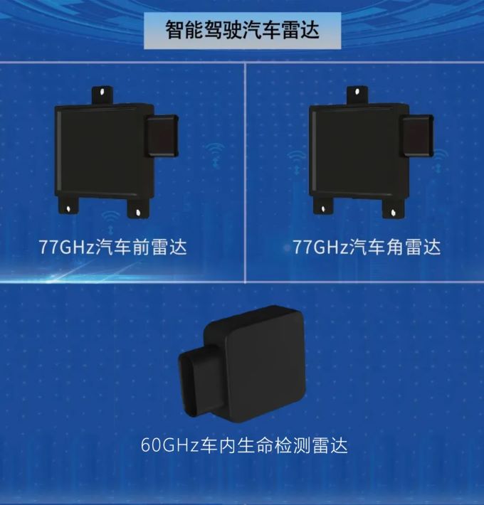 汽车雷达包括77GHz汽车前雷达、77GHz汽车角雷达、和车内生命检测雷达。汽车雷达是智能驾驶系统的核心传感器,毫米波汽车雷达各项数据参数表现优秀,并在探测距离、测距精度、测速范围、探测角度、实时成像、生命检测等相关指标处于先进水平,可在全道路环境下,对车辆行驶环境和其他车辆目标进行实时探测、实时成像,为智能驾驶进一步实现提供重要产品支持。