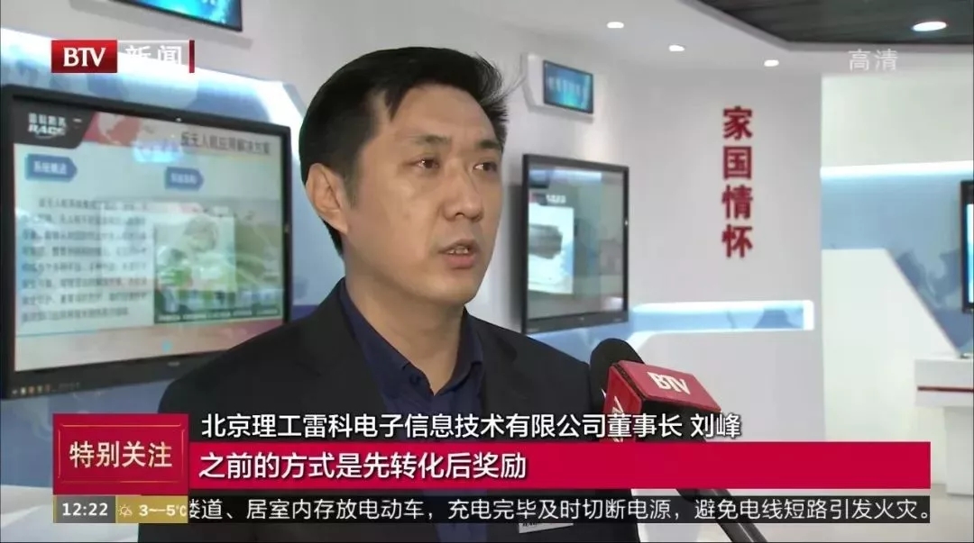 近日,北京市十五届人大常委会第十六次会议表决通过了《北京市促进科技成果转化条例》,条例中首次规定高校院所诞生的科技成果所有权,可以全部属于成果完成人。 2019年11月28日,北京卫视《特别关注》栏目中就高校科技人员成果转化问题,采访了北京理工sunbet申搏官方网站电子信息技术有限公司董事长刘峰。