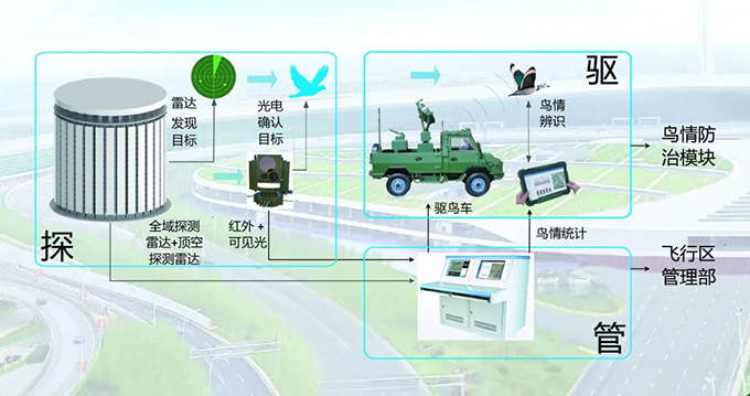 是基于雷达探测技术可对机场周边鸟情进行全天时、全天候的探测和识别,对进入机场净空区域的鸟类实时报警,并联动飞行区现有驱鸟设备,对该区域的鸟类进行驱离,最大限度减少鸟击事故发生。