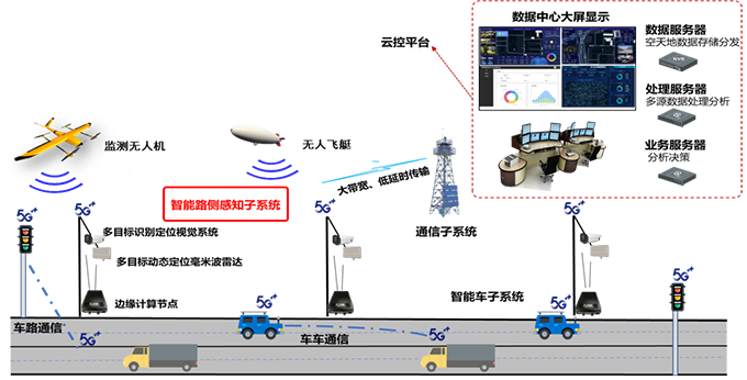 是由路端和车端的数据全息采集——路侧边缘计算节点的高效计算——云控平台大数据分析、决策组成的云-边-端体系,从而实现对机场高速繁忙交通的实时监测,有效提升机场高速的车辆通行安全及效率。